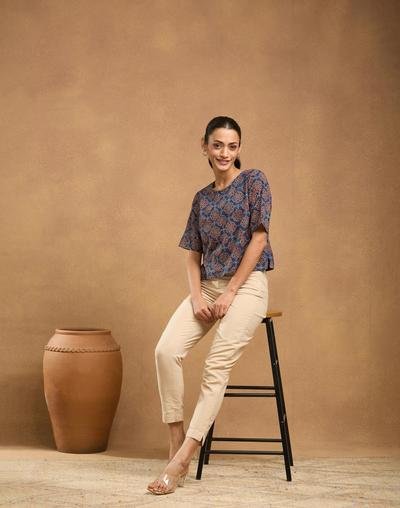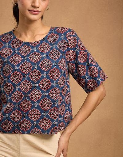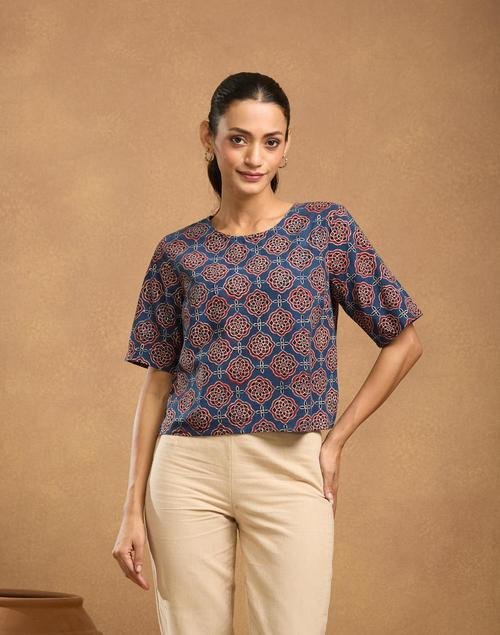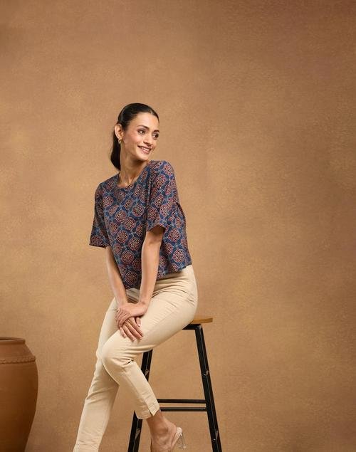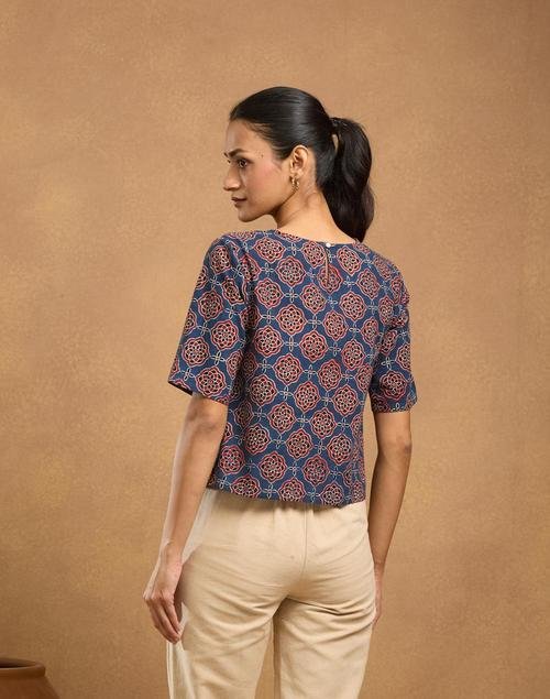 Blue Cotton Ajrakh Printed Short Top for Casual Elegance